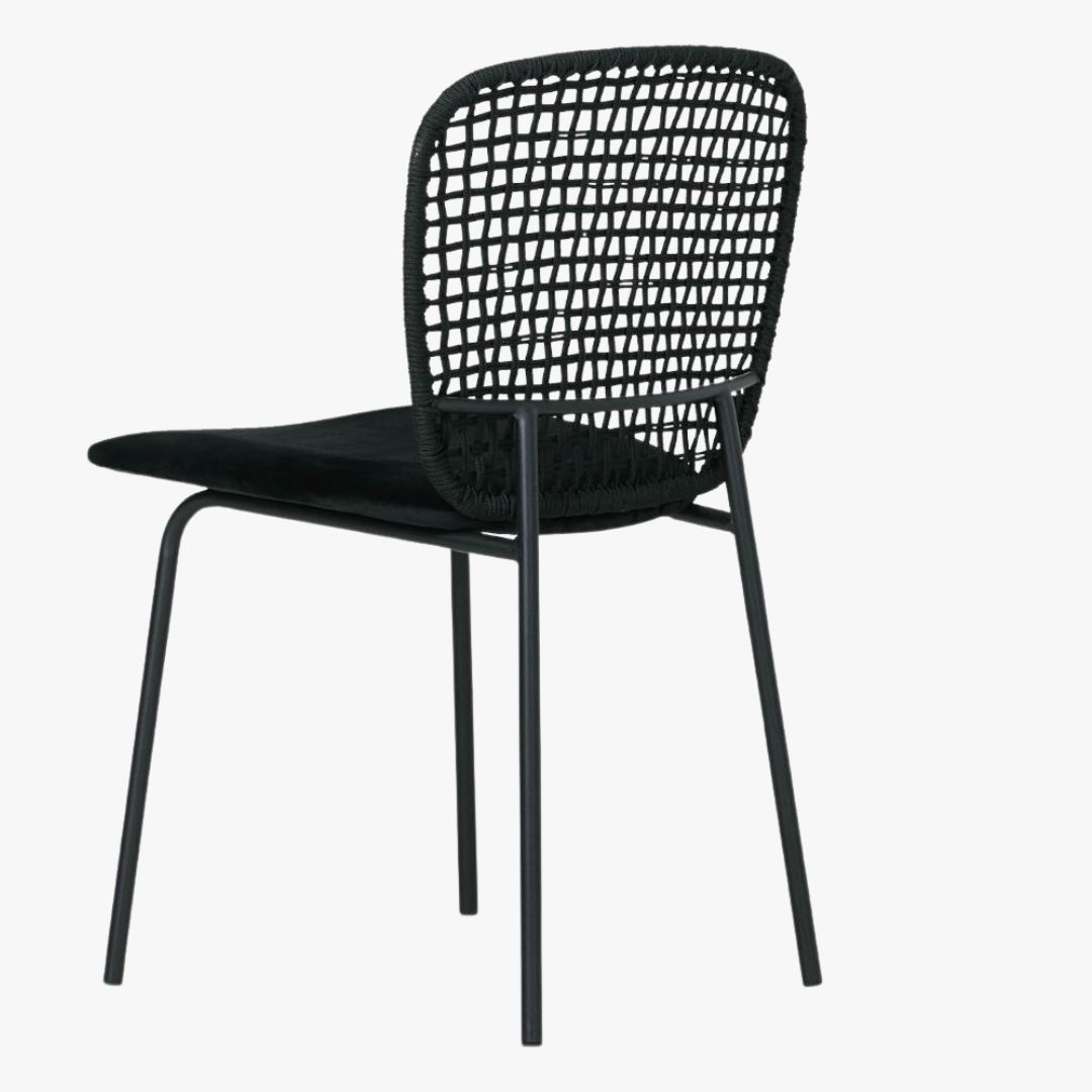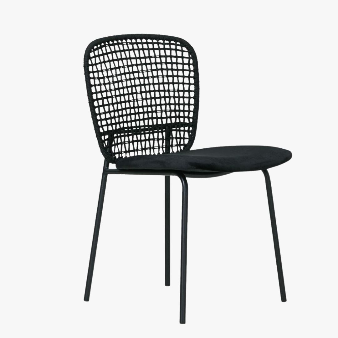 כסא מעוצב בשיא הסטייל – משענת שזורה בחבלים בעבודת יד, הנותנת מראה מאוורר וקליל מאוד. מושב מרופד בגוון החבל ורגליים ברזל שחור מעוגלות ושיקיות. מגיע ב2 צבעים לבחירה: גוון חום עם מושב מרופד בבד אריג בגוון החבל. וגוון שחור עם מושב מרופד בבד קטיפה בגוון שחור. מתאים לכל סגנון של פינת אוכל.