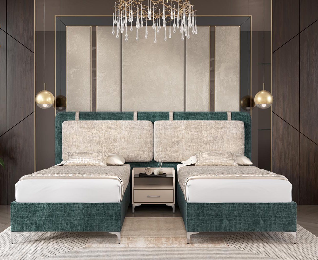 או שתי מיטות יחיד תחת ראש מיטה שלם. בסיס מיטה עשוי מחומרים איכותיים