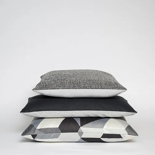 סט 3 כריות בשחור\לבן בשילוב הדפס גיאומטרי יחד עם כריות דו צידיות במשחק גוונים וטקסטורות.