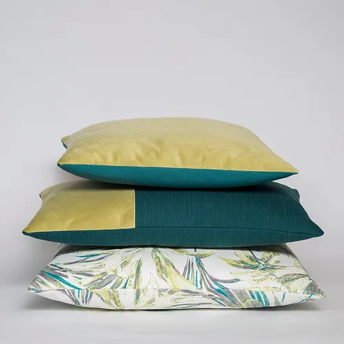 סט 3 כריות בצבעוניות רעננה בשילוב הדפס טרופי יחד עם כריות דו צידיות במשחק גוונים.