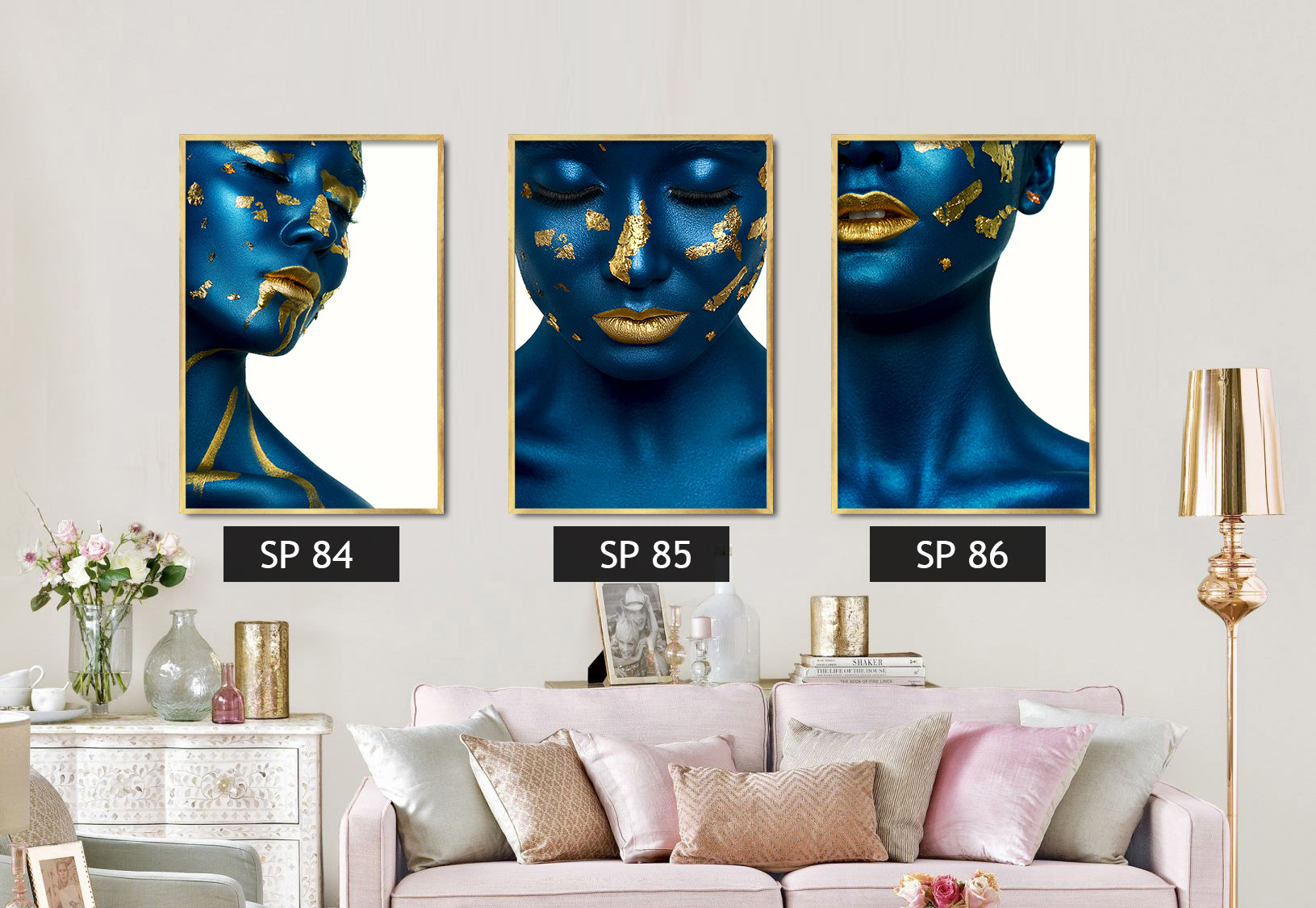 סט 3 תמונות אישה כחולה עם נגיעות זהב