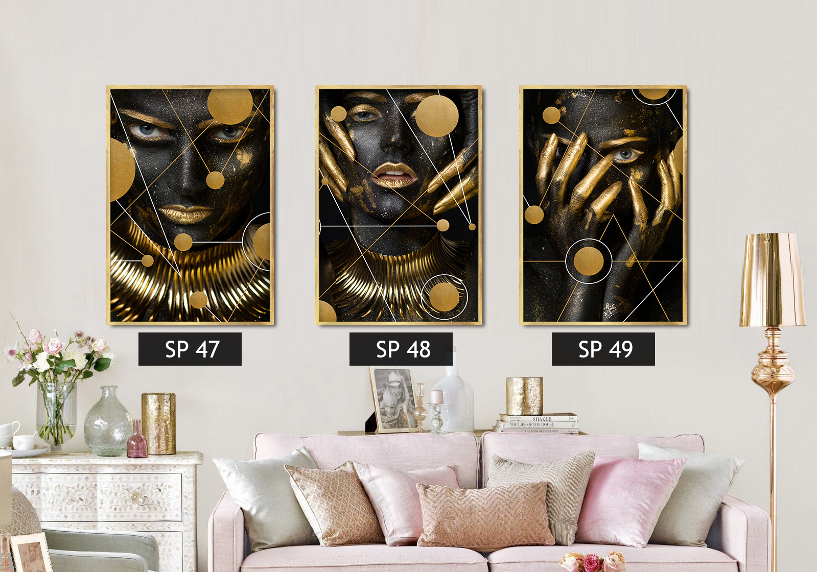 סט 3 תמונות קנבס אישה בצבעים שחור וזהב