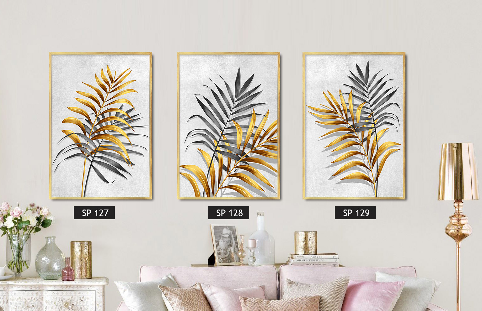 סט 3 תמונות קנבס עלים בצבעים זהב ואפור