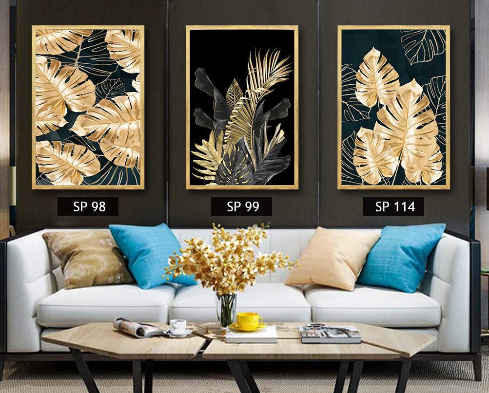 סט 3 תמונות קנבס עלים בצבע זהב על רקע שחור