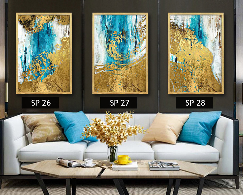 סט 3 תמונות קנבס שילוב של כחול, לבן וזהב