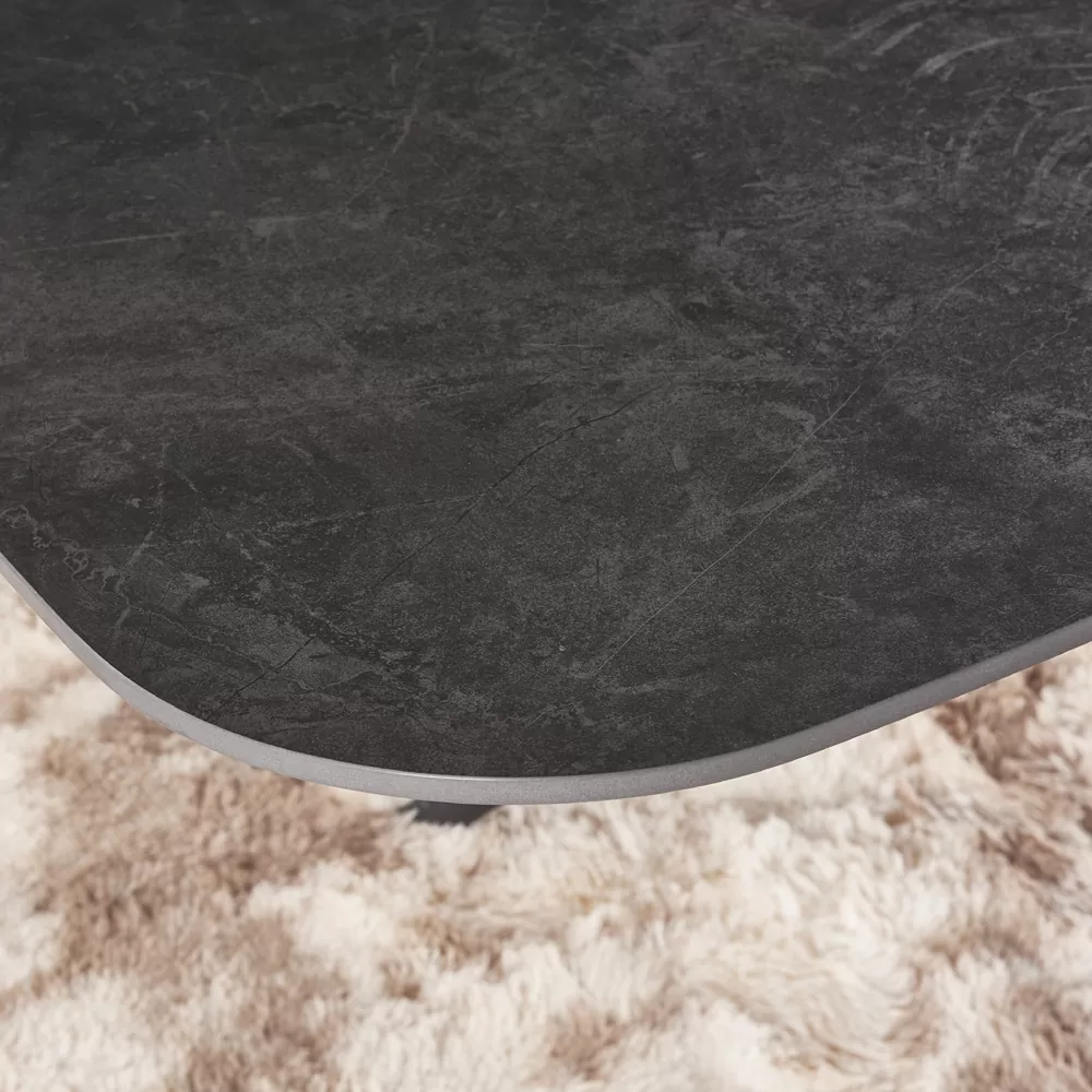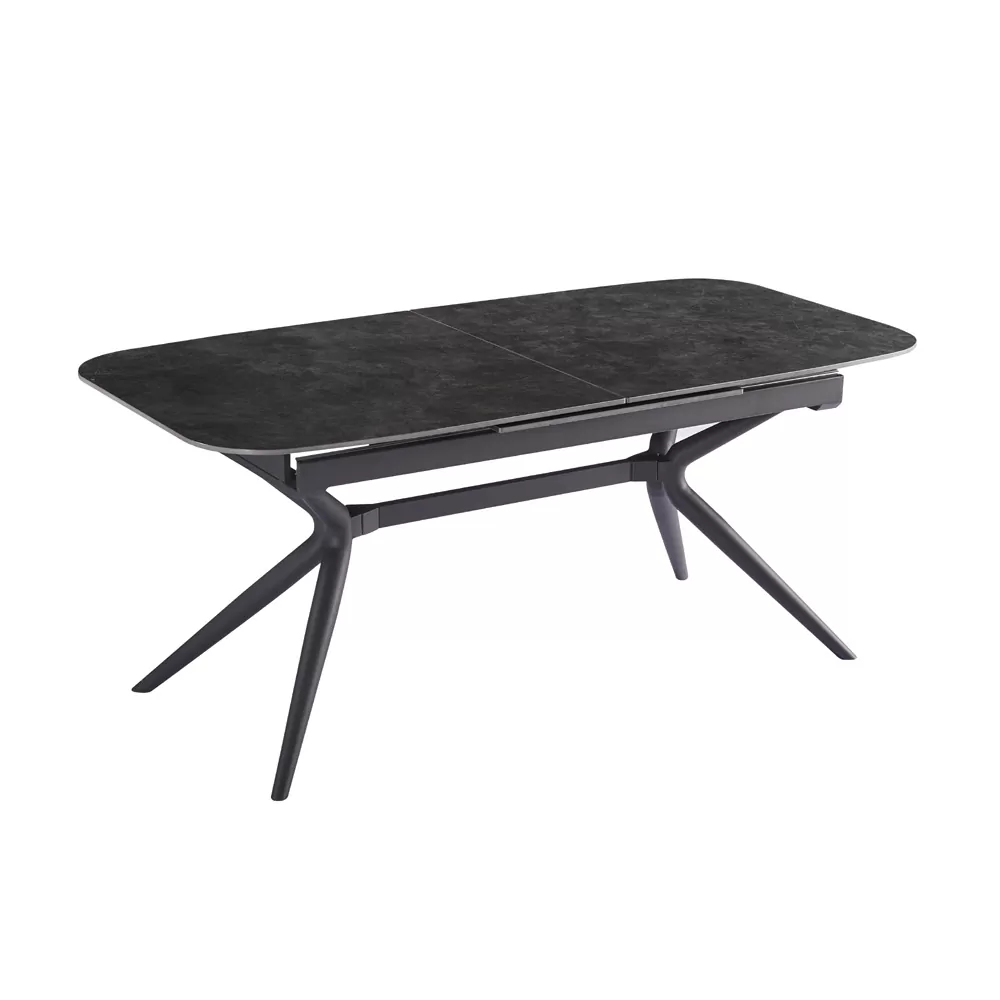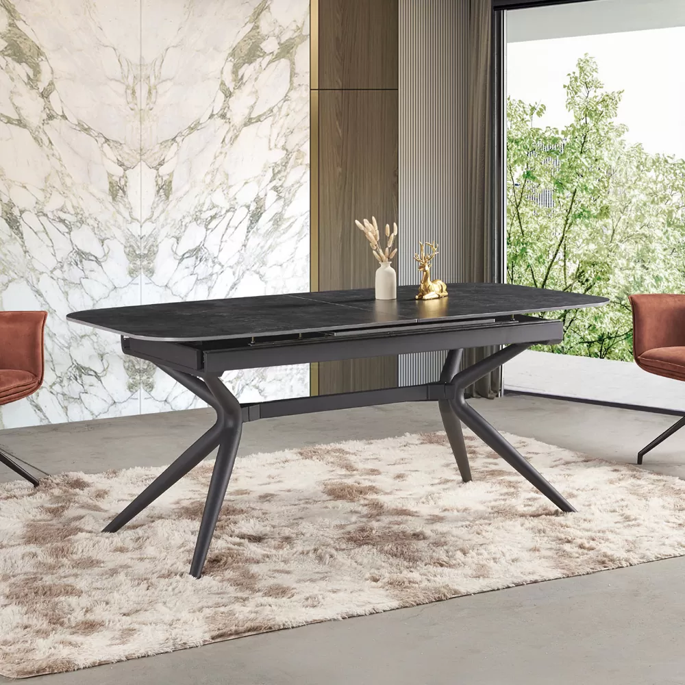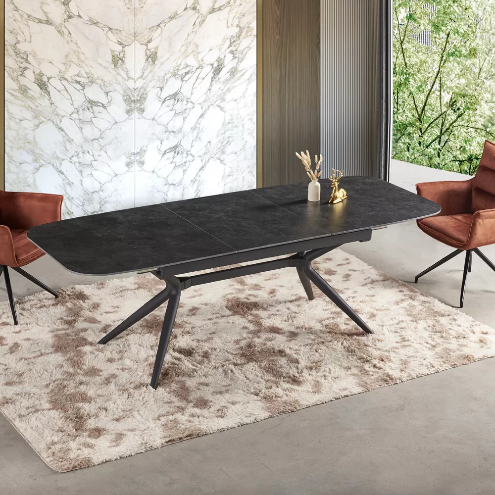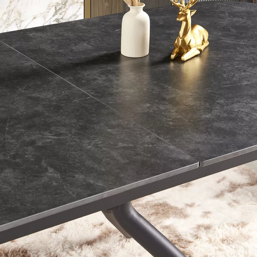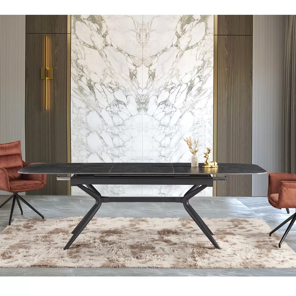 שולחן אוכל קרמיקה באורך 1.8 מ’ נפתח ל- 2.4 מ’ עם רגלי ברזל דגם קשת 180-פחם
