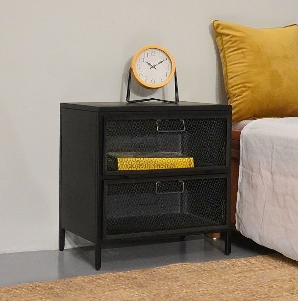 שידת צד מיטה רשת ברזל שידה מהממת ושימושית המגיעה בצבע שחור השידה בעלת 2 מגירות אחסון רהיט בעיצוב רשת המשתלב בצורה טובה בחלל הבית.