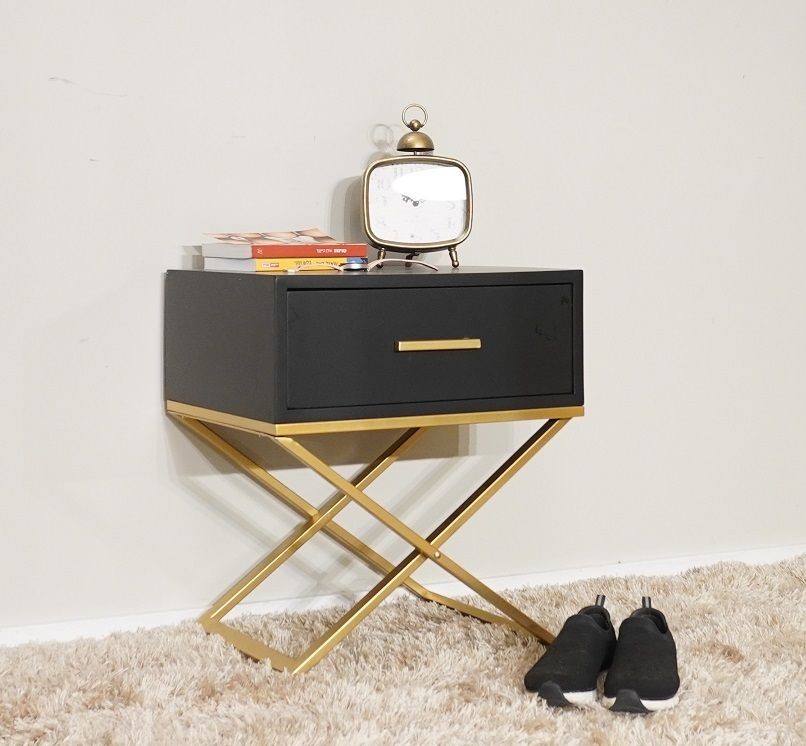 שידת צד גוון שחור בעיצוב מיוחד של רגלי איקס מתכת זהב.
