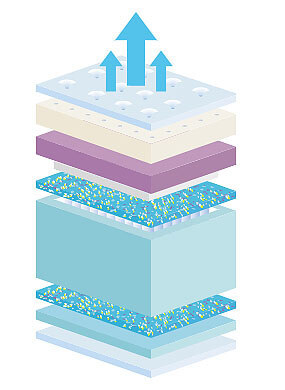 ריפוד – המזרן מרופד בבד סריג, אוורירי, איכותי ונעים למגע שעבר תהליך עיבוד אנטי בקטריאלי למניעת התפתחות רובד חיידקי במשטח השינה.